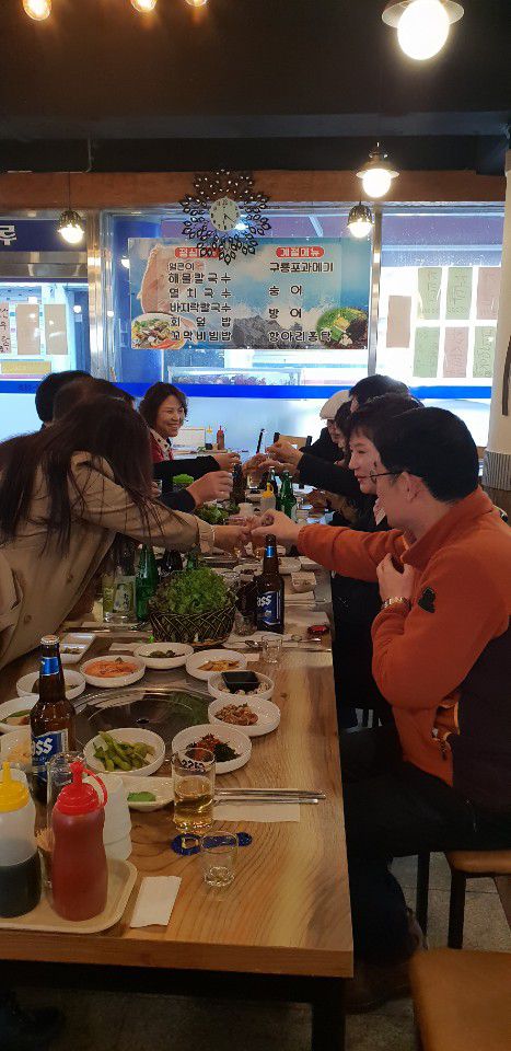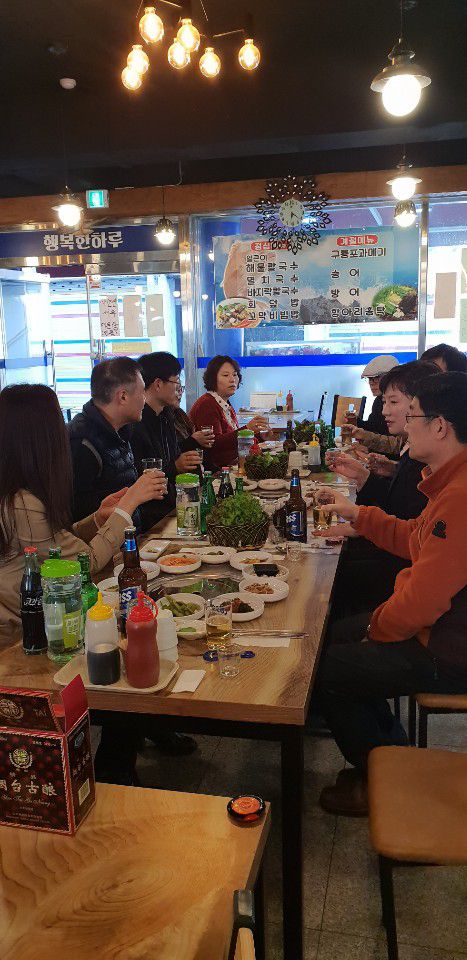 이날은 '불타는 청춘' 횟집에서 연태고량주(김익덕 선생님 기부)를 나눠마시며 화기애애한 분위기 속에 진행되었다.