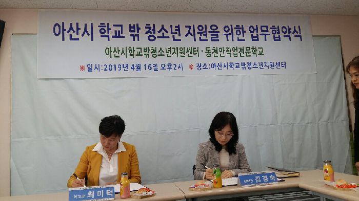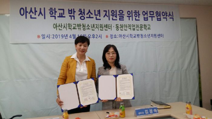 2019년 4월 16일 화요일 오후2시 동천안(희망) 직업 전문학교 교장(최미덕)은 아산시 꿈드림 센터에서 「아산시 학교 밖 청소년 지원을 위한 업무 협약식」을 가졌다.