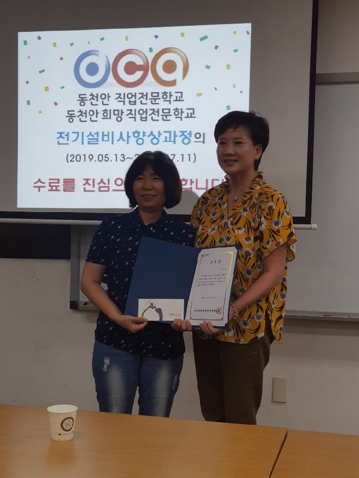 동천안희망직업전문학교는 2019년 7월 11일(목) 근로자 전기설비사 향상과정(2019.05.13 ~ 2019.07.11 105시간)