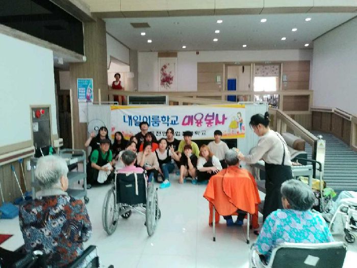 내일이룸학교 담당교사와 자원봉사자분들, 그리고 내일이룸학생들이 18일 행복나눔노인요양병원으로 미용봉사활동을 다녀왔습니다. 더운 날씨에도 불구하고 미용봉사를 다녀온 관계자 여러분들과 기특한 내일이룸학생들의 봉사활동모습입니다.