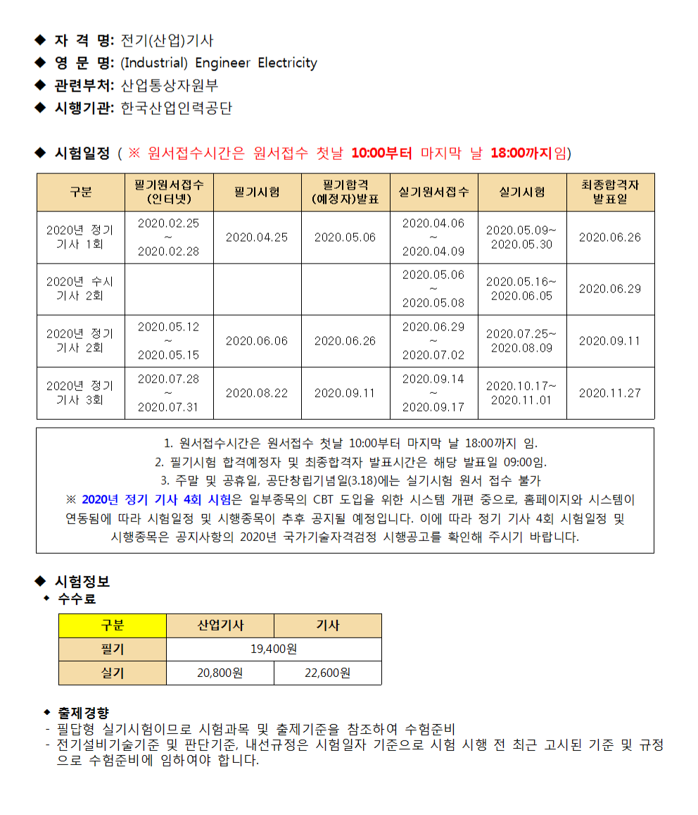 [공지][2020년] 전기(산업)기사 시험 일정